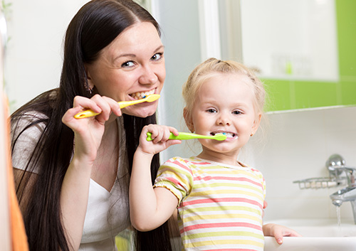 Let your child choose a song to dance to while you all brush for the required two minutes. Your son or daughter may grow to love this silly routine, especially when the parents are clearly dedicated to brushing their own teeth as well.